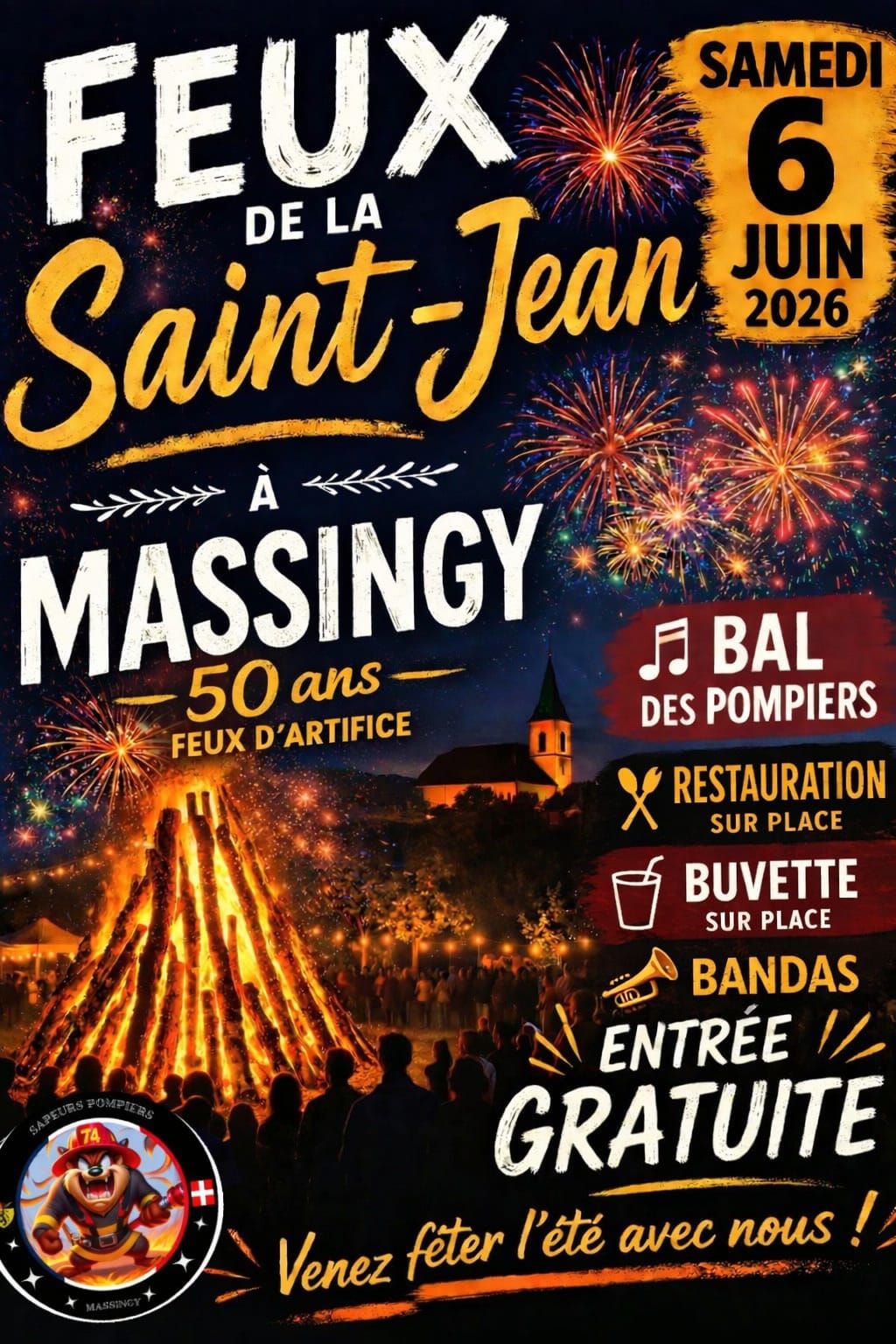 Célébrez les feux de la Saint-Jean à Massingy avec 50 ans de feux d'artifice. Profitez d'un bal des pompiers, de la restauration et d'une buvette sur place, et de l'ambiance festive des bandas.